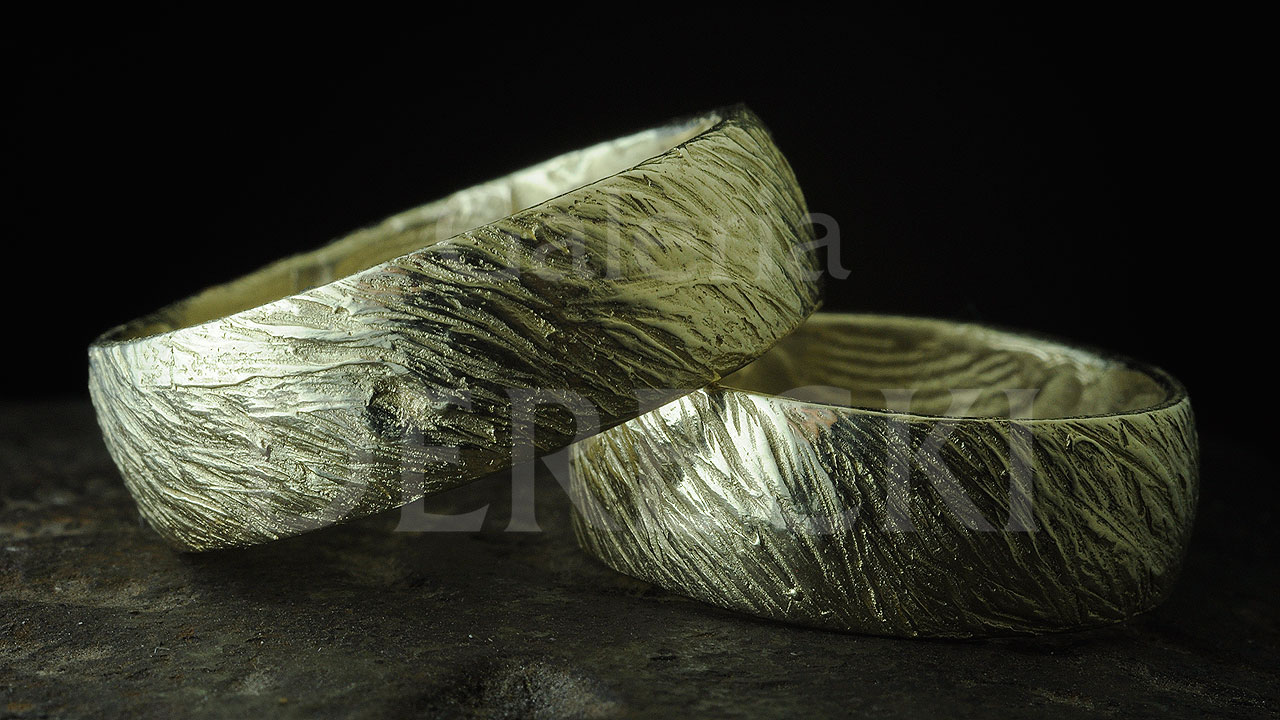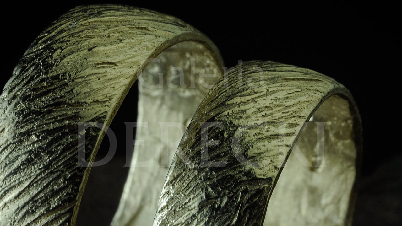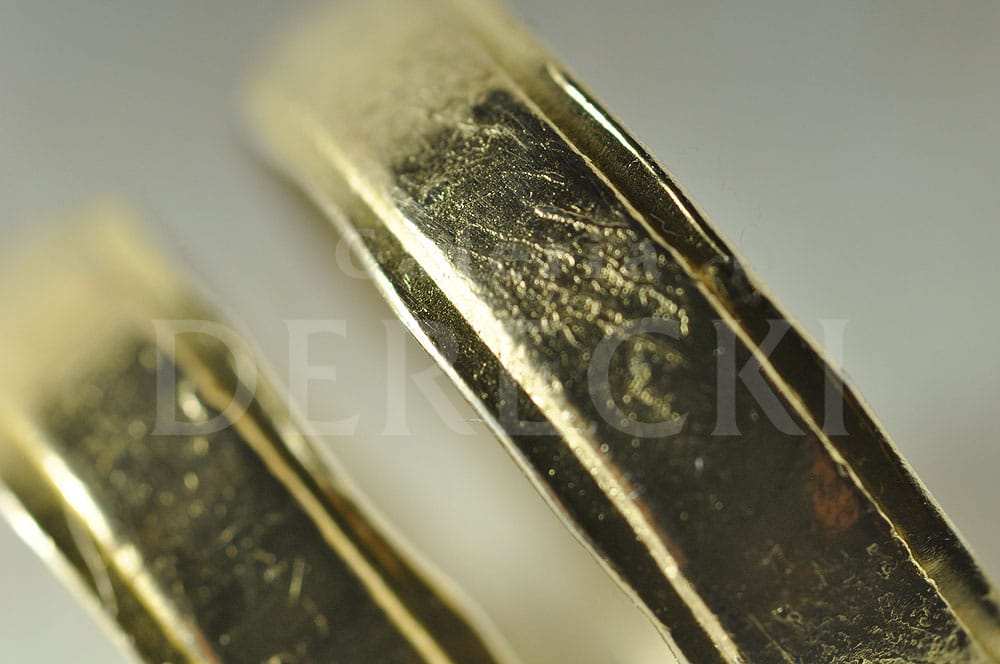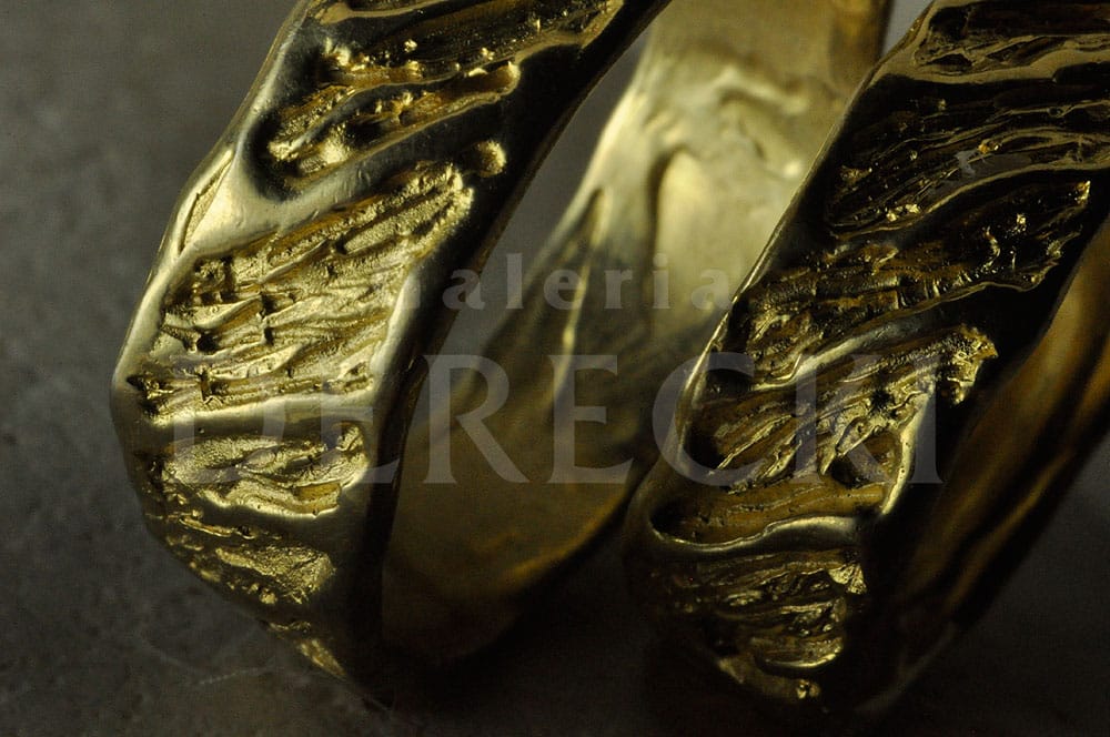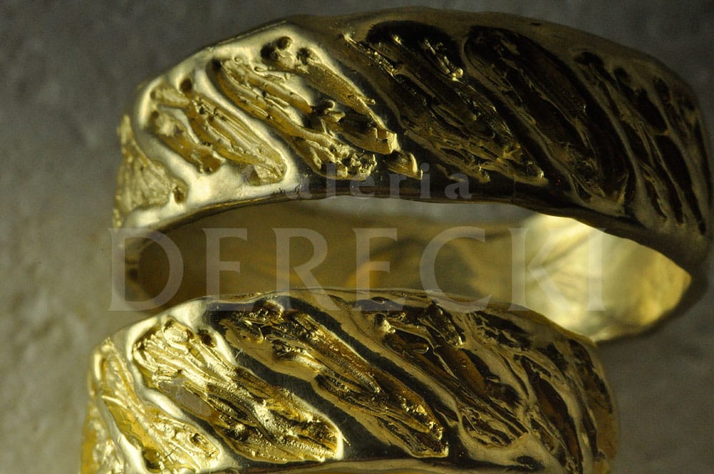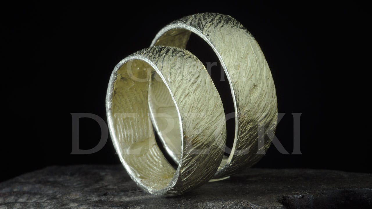 Artystyczne obrączki, niezwykle oryginalne, inne niż wszystkie, bo prawdziwe uczucie zasługuje na wyjątkową pamiątkę. Obrączki odmienne jak charaktery. Zestawione ustępują, dopasowują się do siebie. Kunszt i oryginalność biżuterii na zbliżonym ujęciu, które ukazuje precyzję rzemieślniczej pracy złotnika z Wrocławia. Prace wykonywane są na starym stole złotniczym przy użyciu dawnych technik i narzędzi dzięki czemu, w Galerii Derecki w Sky Tower, powstaje biżuteria inna – niepowtarzalna i wyjątkowa.