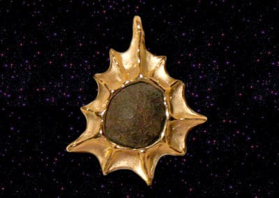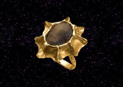 Meteoryt kamienny, orientowany, oprawiony w złotym pierścieniu zaręczynowym i wisiorku. Skład: oliwiny, pirokseny, metaliczne żelazo z niklem, troilit. Pochodzi prawdopodobnie z planetoidy Hebe krążącej wokół Słońca za orbitą Marsa. Wiek: 4,5 miliarda lat. Spadł z deszczem podobnych kamieni wiosną 1960 roku w Burkina Faso w Afryce. Opór powietrza nadał mu kształt orientowany z wyróżnioną przednią i tylną stronę względem kierunku spadania.